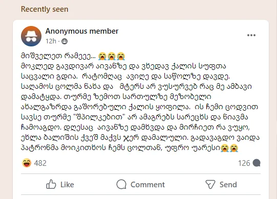 მიშველეთ რამეეე... მოკლედ გავდივარ აივანზე და ვხედავ ქალის სუფთა საცვალი გდია. რატომღაც ავიღე და საწოლზე დავდე. საღამოს ცოლმა ნახა და..