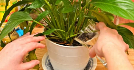 - ქოთნის ზომის მიხედვით ჩაასხი სამი ან ექვსი ს. კ. მომზადებული სასუქი. ამ ხსნარით მორწყით ყვავილები კვირაში ერთხელ ან ორჯერ.