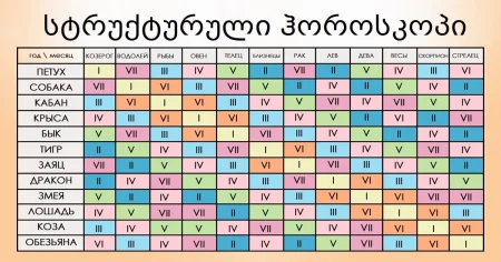 ის დეტალურად შეიმუშავა გრიგორი კვაშამ. სტრუქტურული ჰოროსკოპი 7 პიროვნულ პორტრეტს გამოკვეთს. გაიგეთ თქვენი სპეციალური ცხრილის მიხედვით. ზედა ნაწილში იპოვნეთ თქვენი ზოდიაქო, ქვედაში კი ცხოველი, რომლის წელშიც დაიბადეთ. მათი გამაერთიანებელი ციფრი თქვენს თვისებებს განსაზღვრავს.