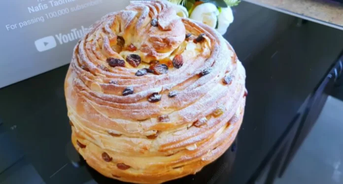 5. ამოსული ცომი გაყავით 2 თანაბარ ნაწილად. თითოეული ნაწილი გააბრტყელეთ თხელ ფენად და წაუსვით დარბილებული კარაქი. ორივე ფენაზე თანაბრად გაანაწილეთ ქიშმიში (წინასწარ დაასხით ცხელი წყალი, გააჩერეთ რამდენიმე წუთი, გადაწურეთ და გააშრეთ) და ნუშის ფანტელი.