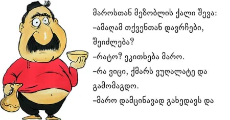 “მაროსთან შემოვა მეზობელი ქალი:-ამაღამ თქვენთან დავრჩები, შეიძლება?-რატო? შეეკითხება მარო.– რა ვიცი, ქმარს ვუთხარი გღალატობო და გამომაგდო. მარო გახედავს დამცინავად და …”